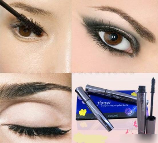 Bước 1: dùng cây mascara Flower dài phủ lên hàng mi của bạn một lớp đen tuyền
