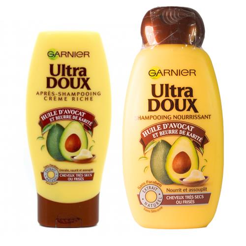 - Dầu gội Ultra Doux của Garnier dưỡng tóc mềm mại với dưỡng chất giàu vitamin A và E từ trái bơ Địa Trung Hải, vừa duy trì độ ẩm, vừa cung cấp dưỡng chất nuôi dưỡng tóc từ gốc đến ngọn và phục hồi tóc hư tổn