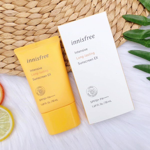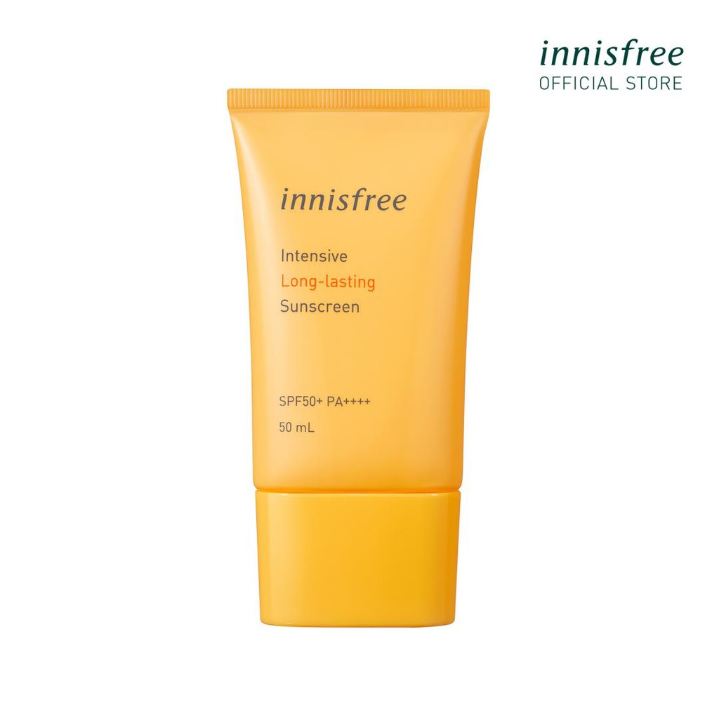 - Innisfree Intensive Long – Lasting Sunsreem SPF 50+ PA++++ có lớp kem ẩm mượt với độ bám dính tuyệt vời giúp làm dịu và giữ ẩm cho da dưới trời nắng, mang lại cho bạn một làn da tươi mát, mịn màng.
