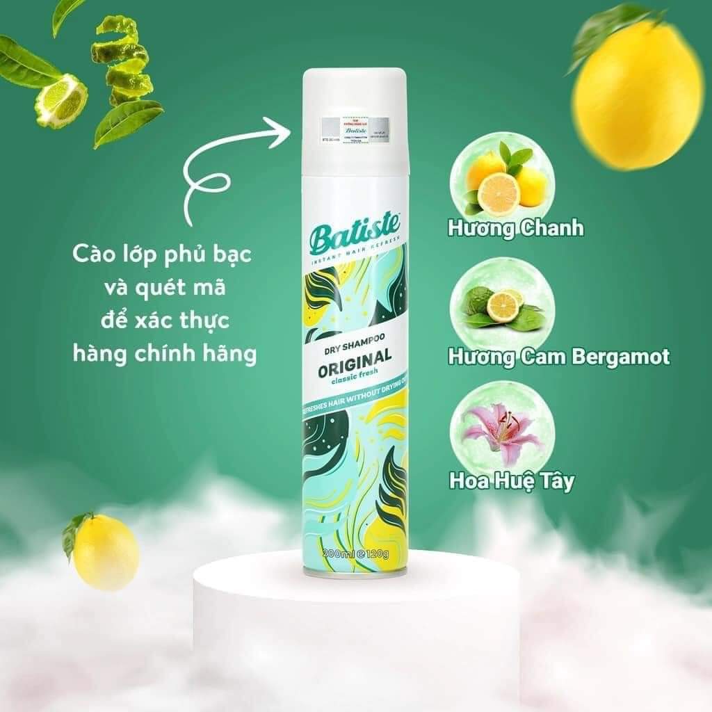 Batiste Dry Shampoo là dòng sản phẩm dầu gội khô nổi tiếng của thương hiệu Batiste xuất xứ tại Anh Quốc. Công thức độc đáo không cần nước giúp nhanh chóng hấp thụ dầu thừa trên da đầu và tóc, làm giảm bết dính, trả lại cho bạn mái tóc tơi mịn, đồng thời hỗ trợ khử mùi hôi và lưu lại hương thơm vô cùng dễ chịu.