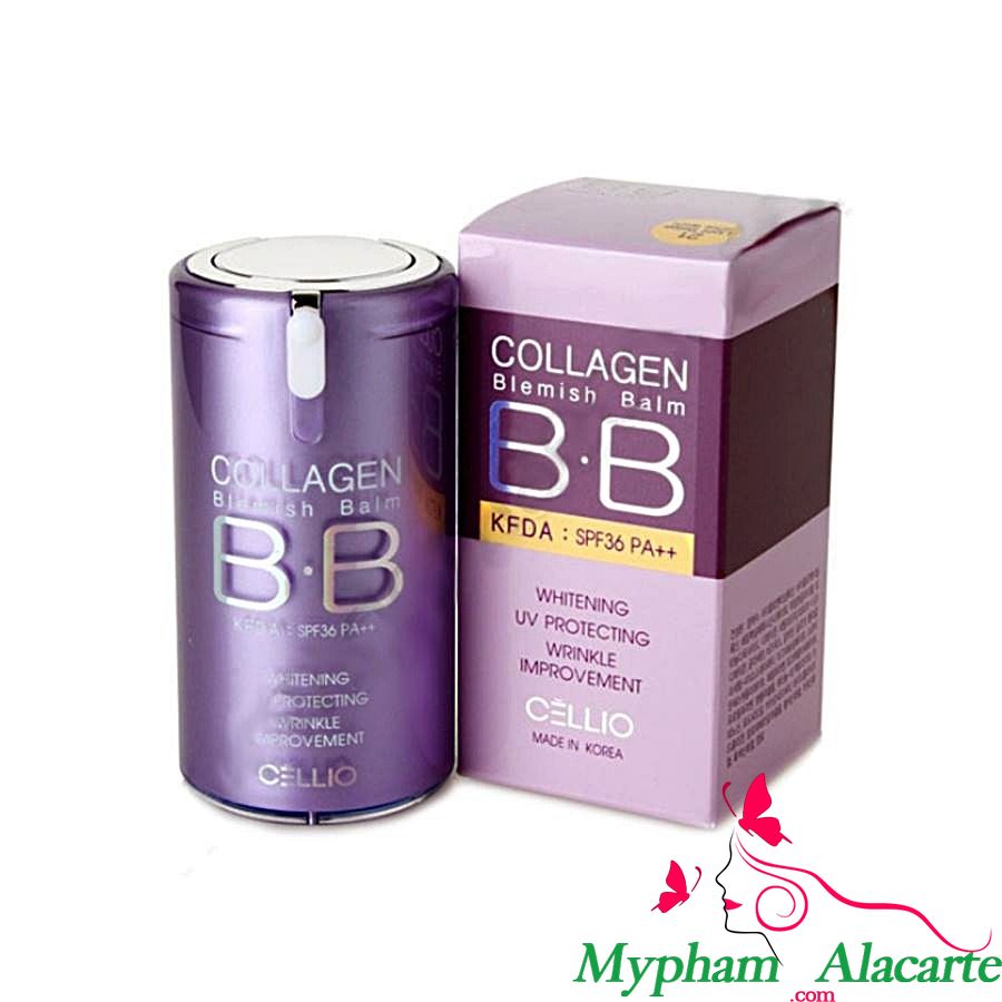 BB Collagen Cellio Cream được chứng nhận bởi KFDA (Cục quản lý dược phẩm và thực phẩm Hàn quốc) xác nhận có tác dụng làm trắng da, chống tác động của các tia cực tím từ ánh sáng mặt trời (UVA, UVB, SPF 36, PA+), thành phần collagen chiết xuất từ da động vật có tác dụng giảm vết thâm ngừa mụn phục hồi da bị hư tổn chống lão hóa làm da căng giảm nhăn tươi trẻ và tràn đầy sức sống.