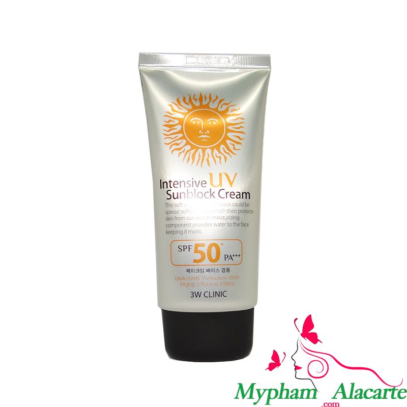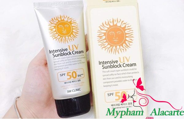 Kem chống nắng 3w Clinic Intensive UV Sunblock có chỉ số chống nắng cao: SPF 50 PA +++ bảo vệ da tối ưu trong 120 phút hoạt động ngoài trời nắng. Với chiết xuất từ thành phần cây nha đam, kem có tác dụng bảo vệ da, tạo màn ngăn tia tử ngoại từ ánh nắng mặt trời đồng thời còn có tác dụng duy trì độ ẩm, cung cấp nước, bổ sung các chất còn thiếu nuôi dưỡng làn da của bạn.