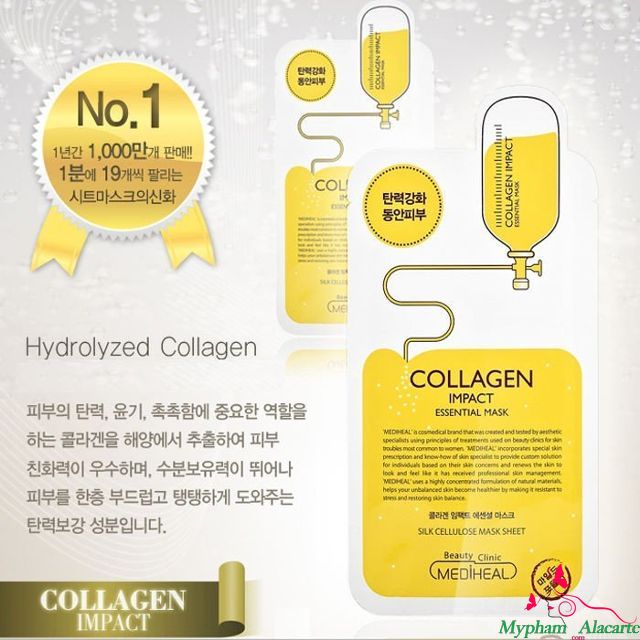 - Mặt Nạ Mediheal Collagen Impact Essential Mask bao gồm các thành phần: Collagen từ biển sâu, Marine Elastin, Vitamin E đóng vai trò quan trọng trong việc làm da láng mịn và tăng độ đàn hồi của da. Sản phẩm giúp nuôi dưỡng và cung cấp sức sống, độ ẩm, mang lại vẻ tươi trẻ cho làn da sắp và đang lão hóa, đồng thời nâng cơ mặt, tránh tình trạng chảy xệ.