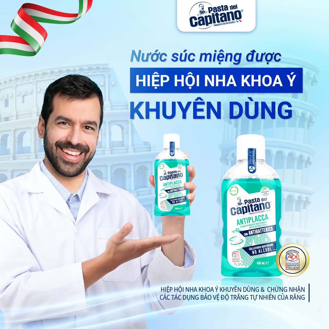 Nước Súc Miệng Bảo Vệ Khoang Miệng Toàn Diện Pasta Del Capitano Protezione Mouthwash là dòng sản phẩm chăm sóc răng miệng cao cấp từ Ý, nổi bật với công thức không chứa cồn kết hợp keo ong (Propolis), trà xanh, fluoride và Sulfetal Zn®. Sản phẩm giúp ngăn ngừa vi khuẩn, bảo vệ nướu, duy trì men răng khỏe mạnh và hơi thở thơm mát suốt nhiều giờ.