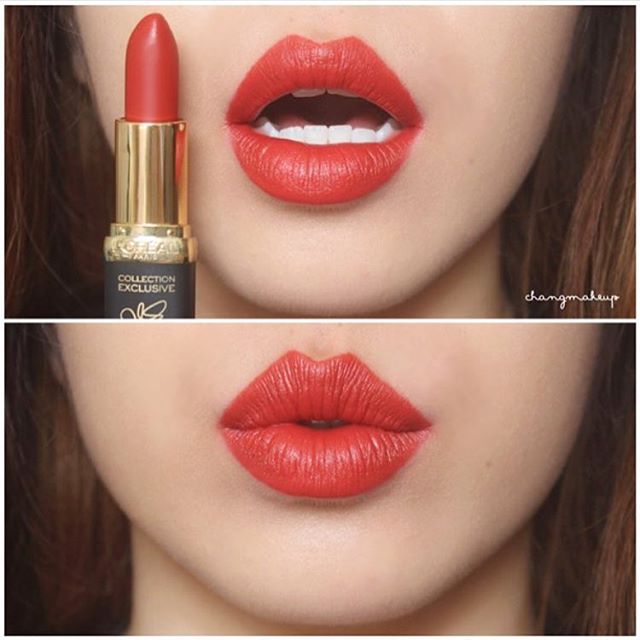- L’Oreal Paris Collection Exclusive màu 402 Blake’s Red – Màu đỏ ruby với undertone xanh, lớp phủ matte, lên màu chuẩn ngay từ lần đánh đầu tiên. Nếu bạn yêu thích phong cách vintage, thanh lịch và cổ điển như kiểu Taylor Swift trong Album “Red” của cô nàng thì bạn đã tìm đúng thỏi son lý tưởng rồi đấy. Nghe thì biết màu Blake’s Red sinh ra là dành cho các nàng da trắng, tông lạnh rồi nhỉ.