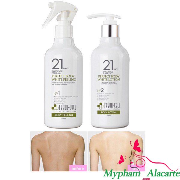 Phụ nữ Châu Á luôn chuộng vẻ đẹp ngọc ngà tinh tế, da trắng mịn không tỳ vết như Phạm Băng Băng hoặc trong veo nữ thần Yoona (SNSD) từ đó công cuộc săn lùng bí quyết bắt đầu. Và giờ đây việc sở hữu một làn da trắng hồng mịn màng, vô cùng đơn giản chỉ trong 2 bước: Tắm trắng với Perfect Body White Peeling và Dưỡng sâu cùng 21 days Perfect Body White Lotion sẽ mang đến cho bạn một làn da Bạch Tuyết đáng ghen tỵ. Được chiết xuất từ 100% thành phần tự nhiên, của tập đoàn dược mỹ phẩm Reyou Cell nổi tiếng xứ sở Kim Chi chuyên về dòng làm đẹp trị liệu, trắng da an toàn, trẻ hóa,… được các bệnh viện, trung tâm thẩm mỹ,..tại Hàn Quốc tin tưởng. Hãng đã khẳng định bộ đôi 21 days Perfect Body White Peeling được bổ sung chiết xuất từ tế bào gốc thực vật giúp nuôi dưỡng làn da trắng mịn – tươi trẻ chỉ sau 3 tuần sử dụng.