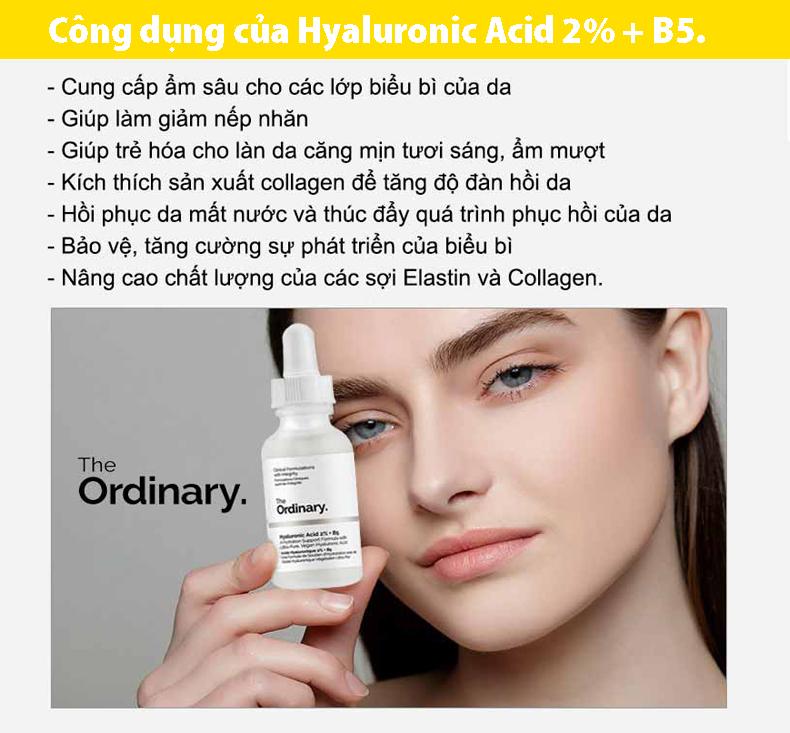 Tinh chất Serum The Ordinary Hyaluronic Acid 2 % + B5 là sự lựa chọn hàng đầu cho chị em nào da yếu, bị nhiều vấn đề do lớp màng bảo vệ da bị hỏng hoặc da nứt nẻ thì có thể dùng nhé. giúp giảm ngứa, sưng đỏ, phục hồi da sau lăn kim, trị mụn giúp đẩy nhanh quá trình lành vết thương, tăng độ bền vững cho các mô liên kết sẹo