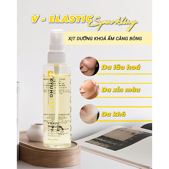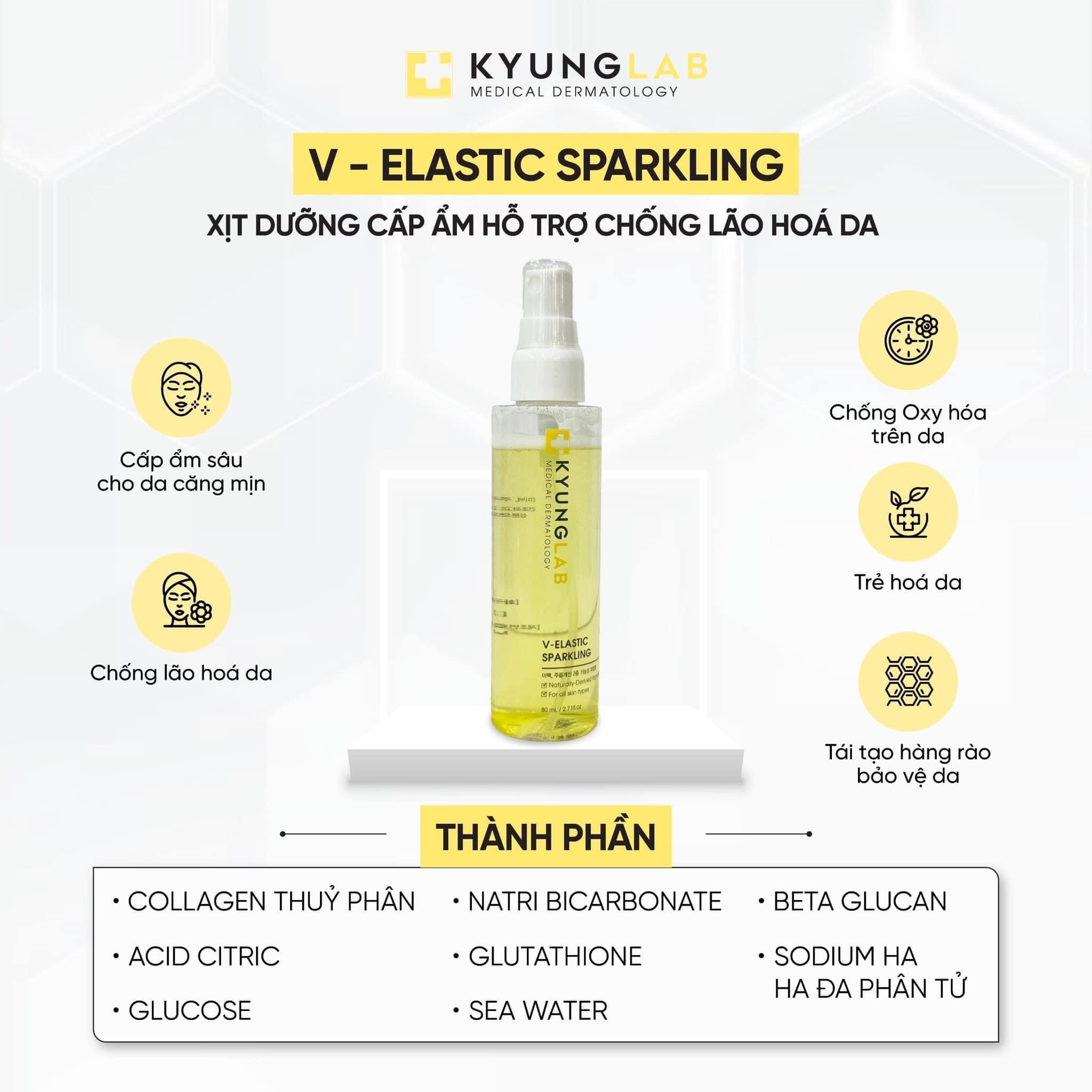 Xịt dưỡng khoá ẩm căng bóng KyungLab – sản phẩm nhập khẩu 100% Hàn Quốc là xịt “tinh chất trẻ hoá da”, với độ tinh khiết cao hơn, chứa nhiều khoáng chất, chất dinh dưỡng và nguồn vi lượng phong phú hơn. KyungLab V-Elastic Sparkling với khả năng cân bằng độ ẩm, làm mềm và mướt làn da, các nếp nhăn nhờ đó “phẳng, mịn” hơn, giúp se nhỏ lỗ chân lông, cố định lớp trang điểm khiến da toả sáng tự nhiên và khoẻ mạnh.